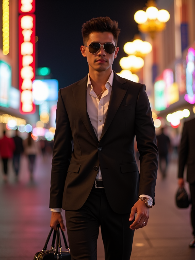 model strolling along the Las Vegas Strip at night. at night. the model sports a trendy ensemble, like a stylish blazer and tailored pants, with flashy accessories.