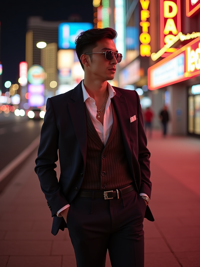 model strolling along the Las Vegas Strip at night. at night. the model sports a trendy ensemble, like a stylish blazer and tailored pants, with flashy accessories.
