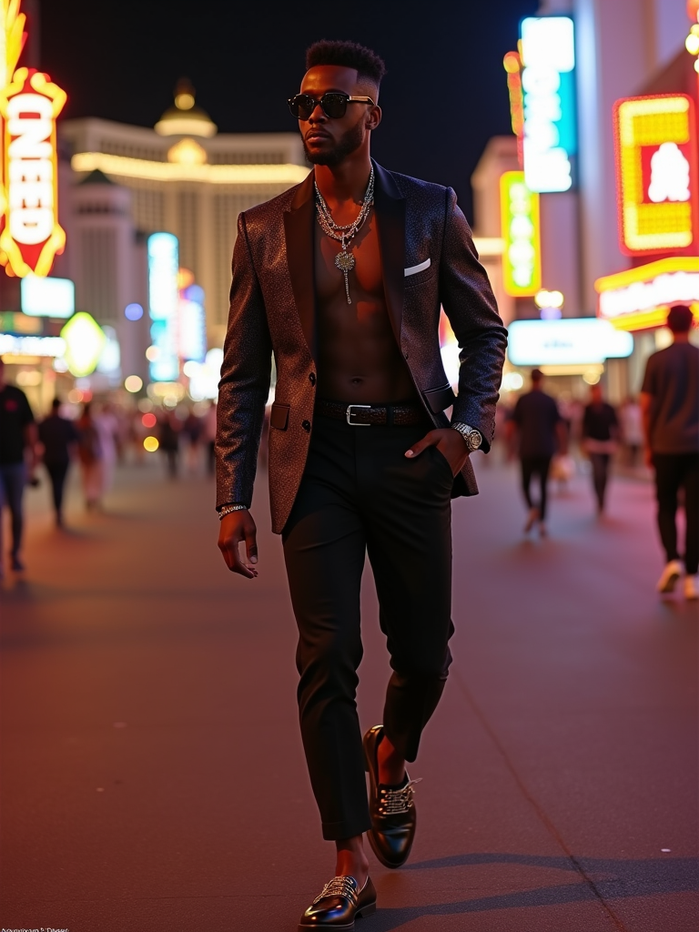 model strolling along the Las Vegas Strip at night. at night. the model sports a trendy ensemble, like a stylish blazer and tailored pants, with flashy accessories.