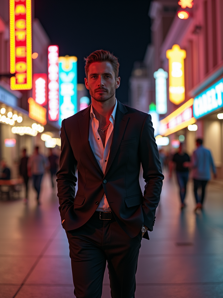 model strolling along the Las Vegas Strip at night. at night. the model sports a trendy ensemble, like a stylish blazer and tailored pants, with flashy accessories.