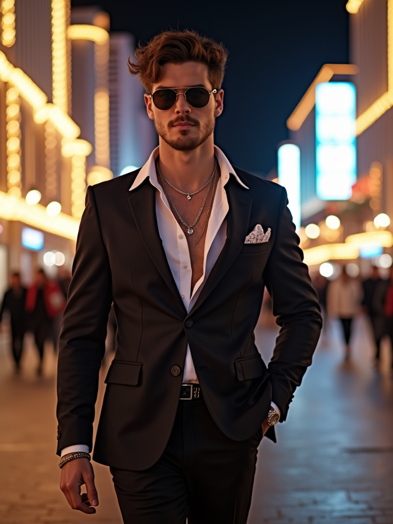 model strolling along the Las Vegas Strip at night. at night. the model sports a trendy ensemble, like a stylish blazer and tailored pants, with flashy accessories.