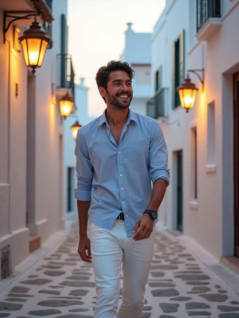 model strolling through narrow Mykonos streets, wearing white jeans with a light blue shirt, warm lantern lights illuminating the path