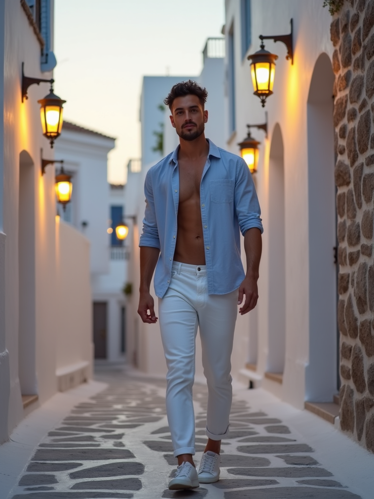 model strolling through narrow Mykonos streets, wearing white jeans with a light blue shirt, warm lantern lights illuminating the path