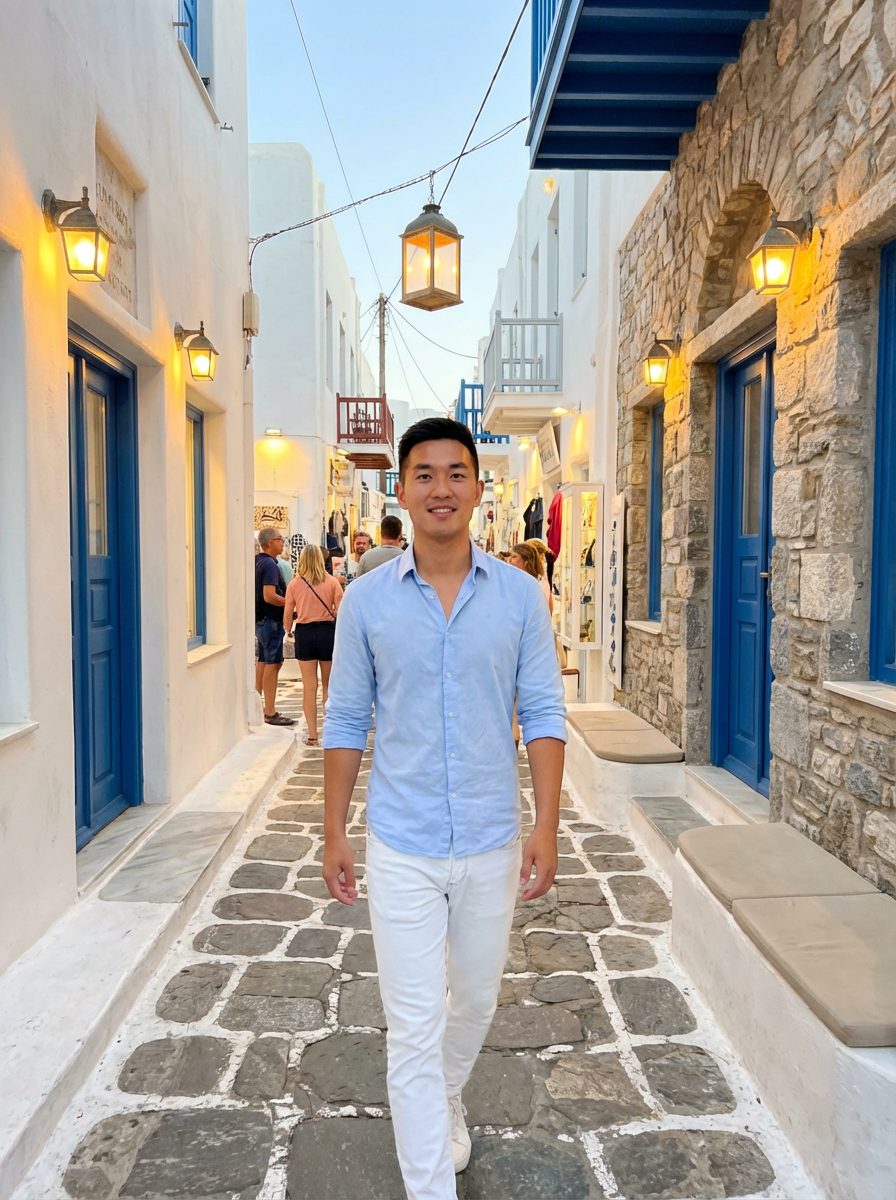model strolling through narrow Mykonos streets, wearing white jeans with a light blue shirt, warm lantern lights illuminating the path