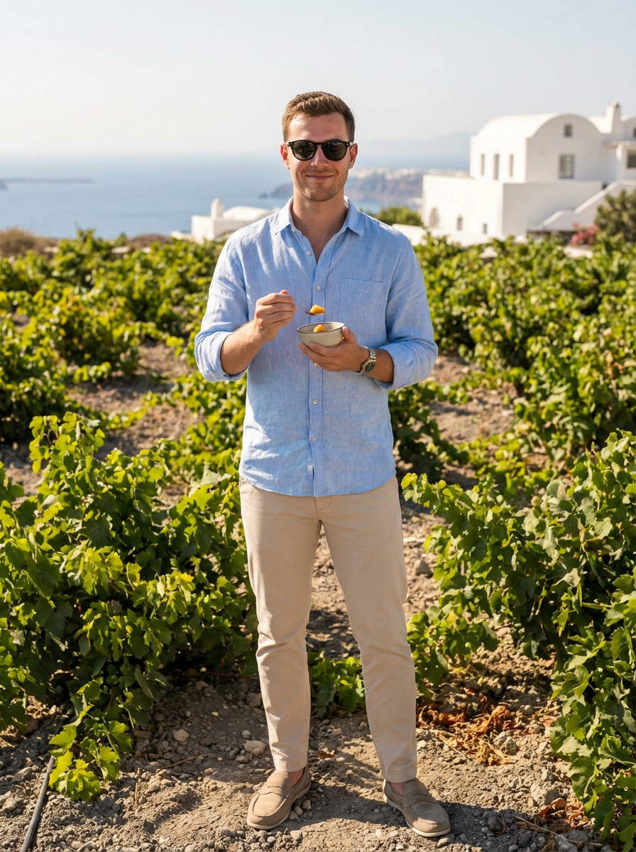 model tasting food at a Santorini farm, wearing smart casual outfit with sunglasses, rows of grapevines with sea views