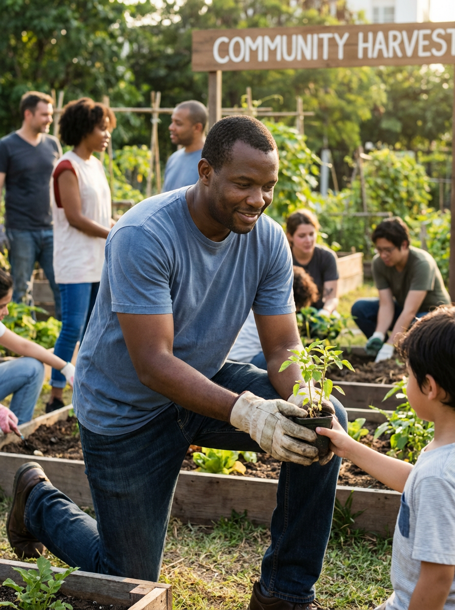 model volunteering or community activity, kind-hearted personality, casual helpful setting
