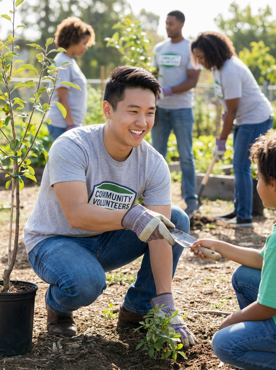 model volunteering or community activity, kind-hearted personality, casual helpful setting