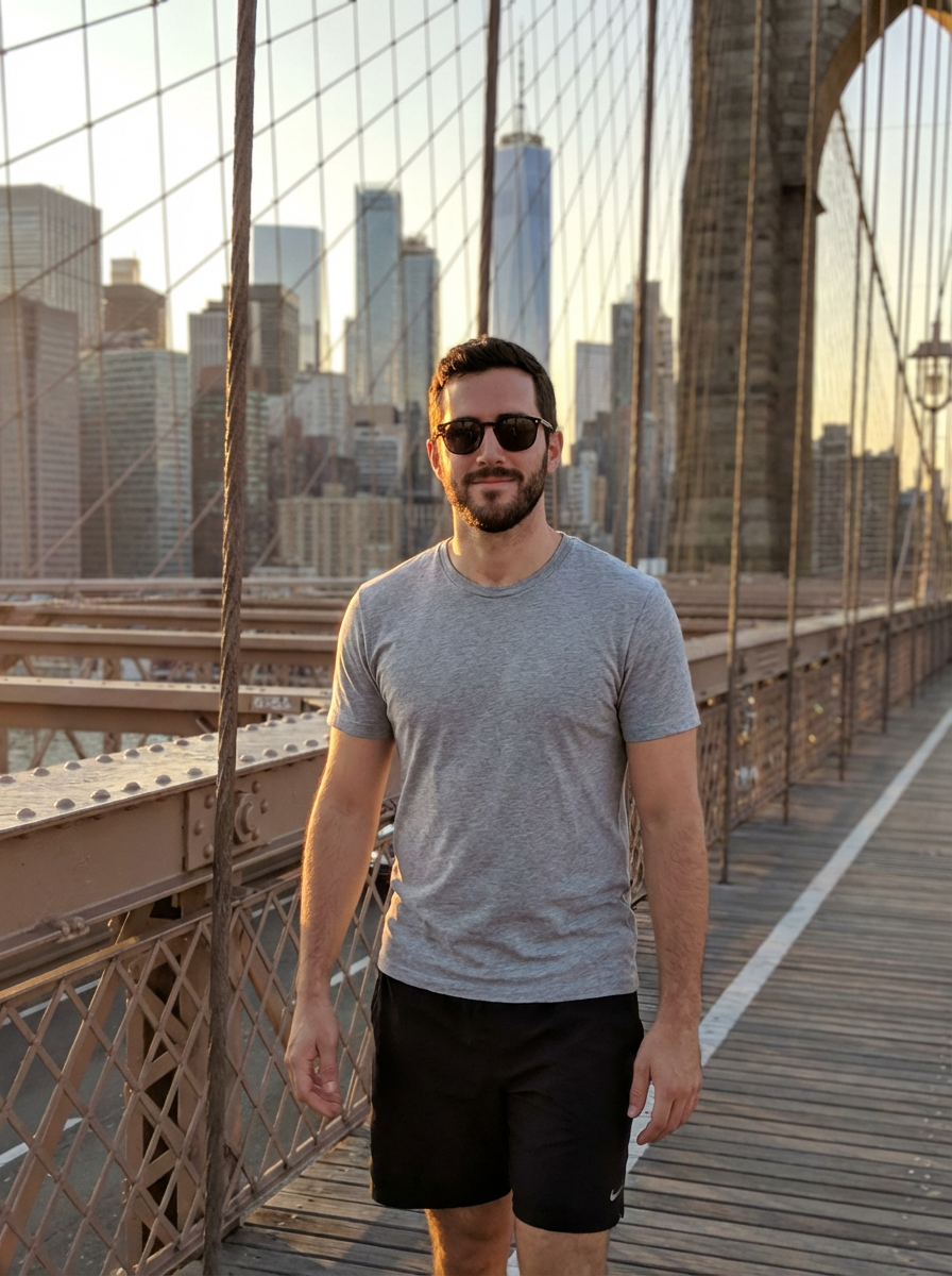 model walking across Brooklyn Bridge, Manhattan skyline behind, casual cool style, golden hour