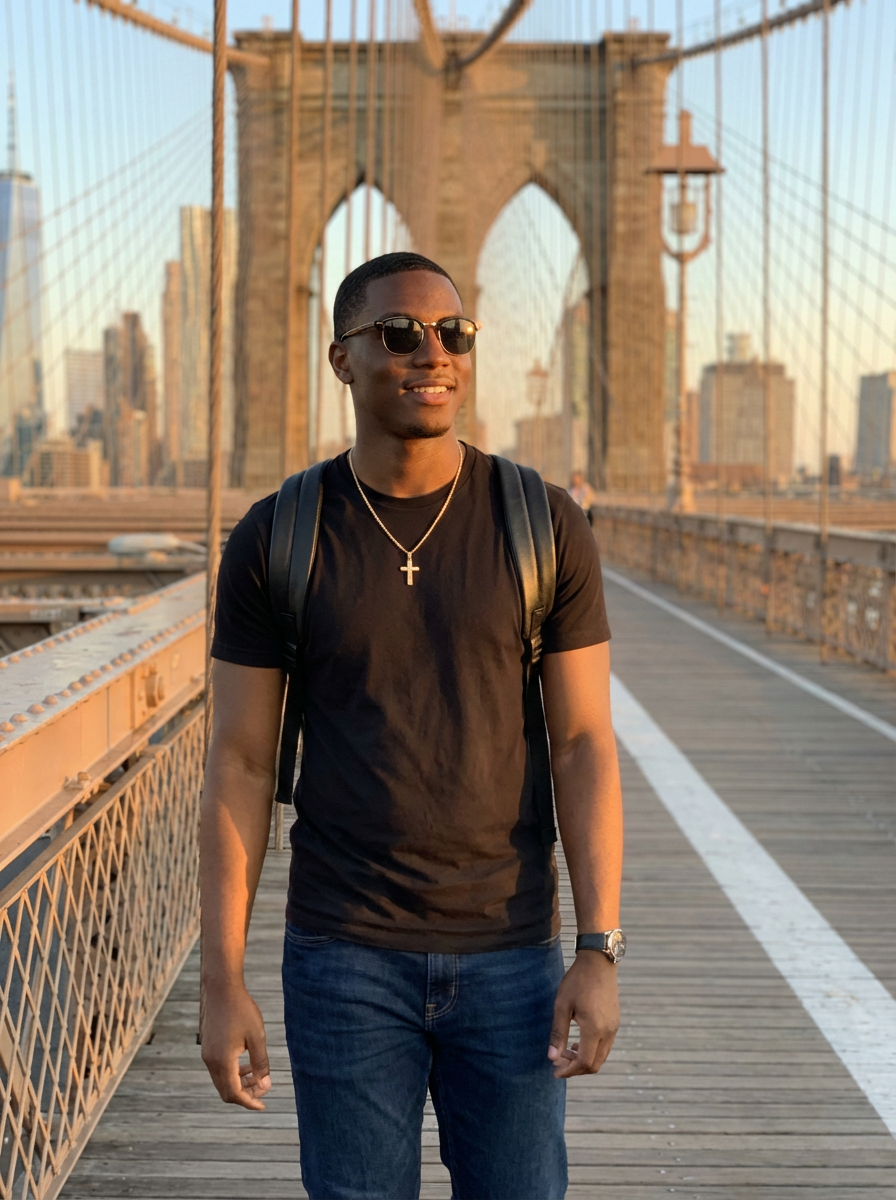 model walking across Brooklyn Bridge, Manhattan skyline behind, casual cool style, golden hour