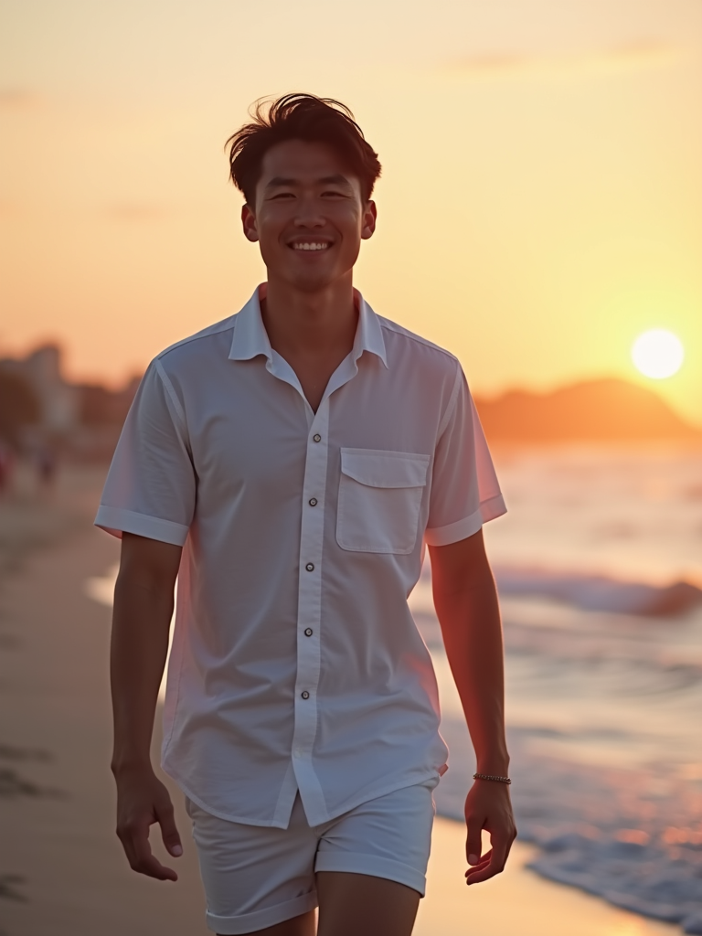 model walking along Ornos Beach at twilight, wearing white shorts with a light cotton shirt, warm evening atmosphere