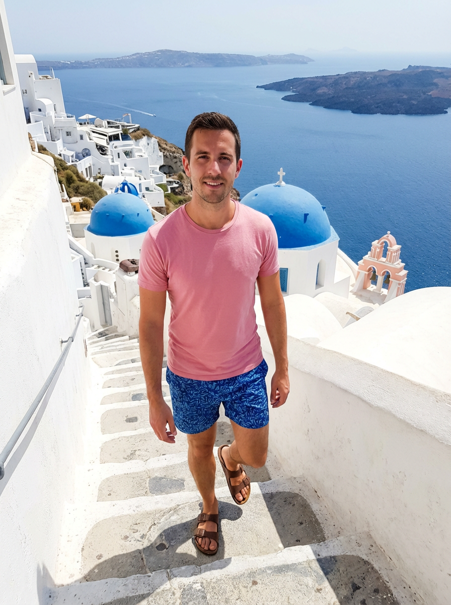 model walking down the white steps of Fira, wearing casual shorts with a fitted t-shirt, whitewashed buildings and blue sea views