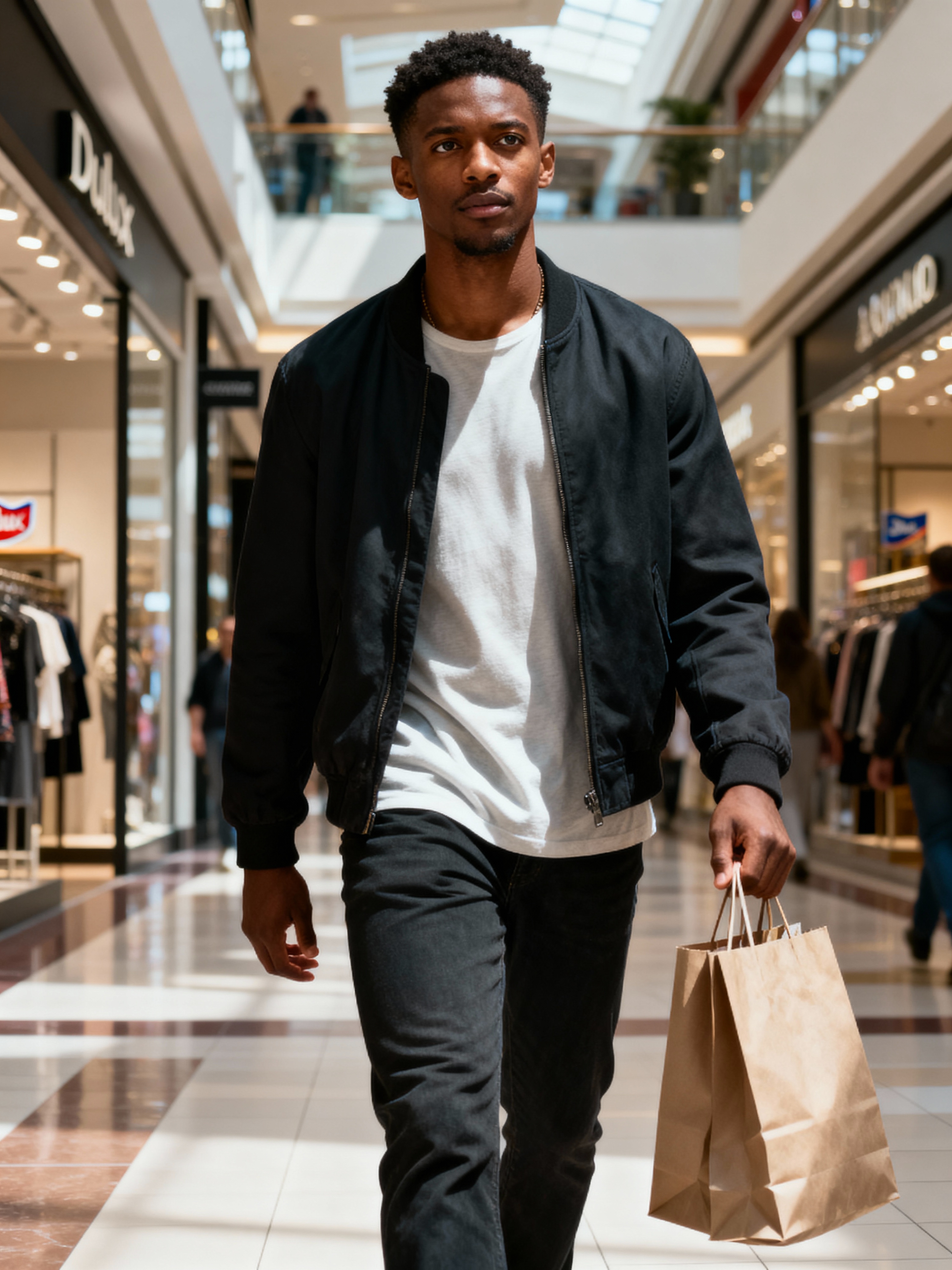 model walking in a shopping mall, holding shopping bags. shops in background