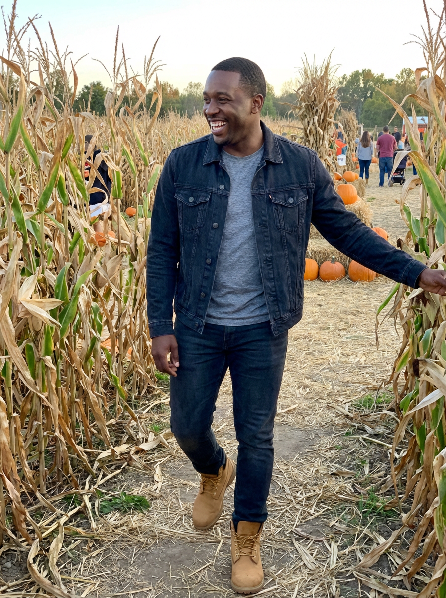 model walking through corn maze, fall festival fun, casual autumn outfit, playful moment