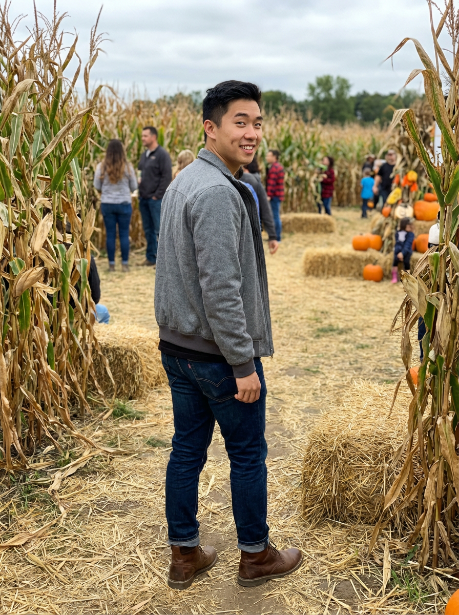 model walking through corn maze, fall festival fun, casual autumn outfit, playful moment