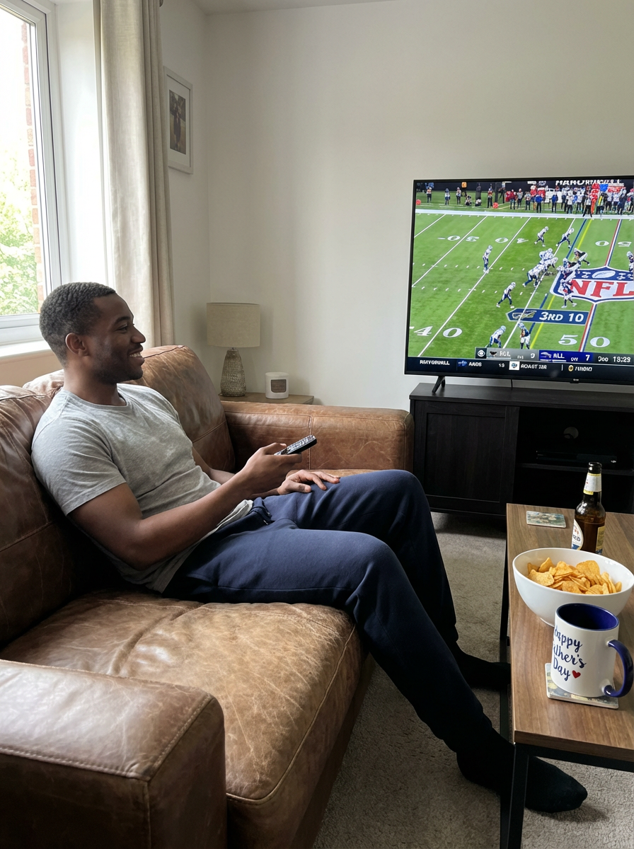 model watching sports on TV, Fathers Day relaxation, comfortable home setting, snacks and drinks