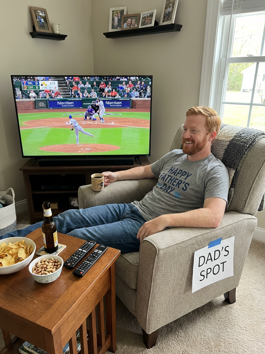 model watching sports on TV, Fathers Day relaxation, comfortable home setting, snacks and drinks