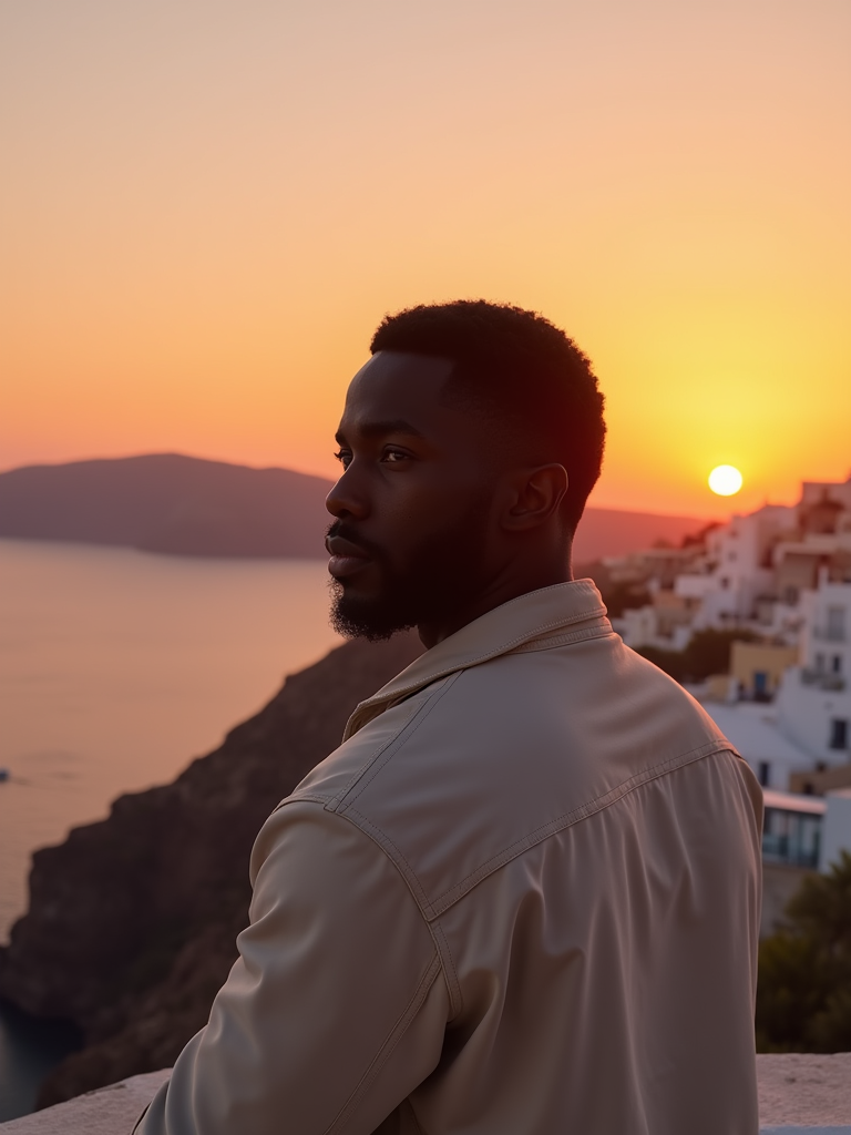 model watching sunset in Imerovigli, wearing smart casual attire with light jacket, famous Santorini sunset colors