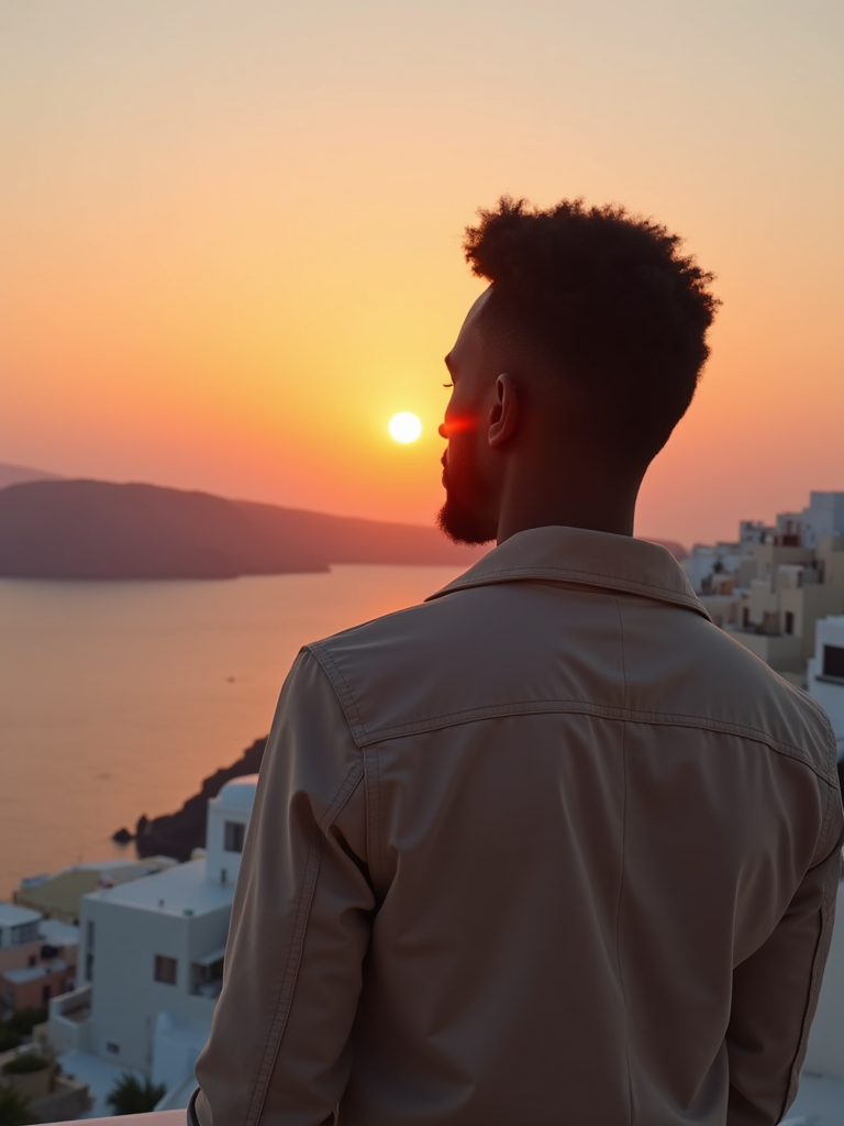 model watching sunset in Imerovigli, wearing smart casual attire with light jacket, famous Santorini sunset colors
