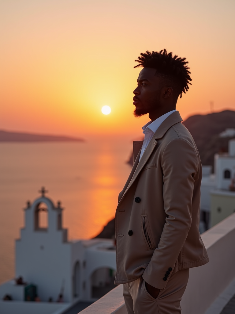 model watching sunset in Imerovigli, wearing smart casual attire with light jacket, famous Santorini sunset colors