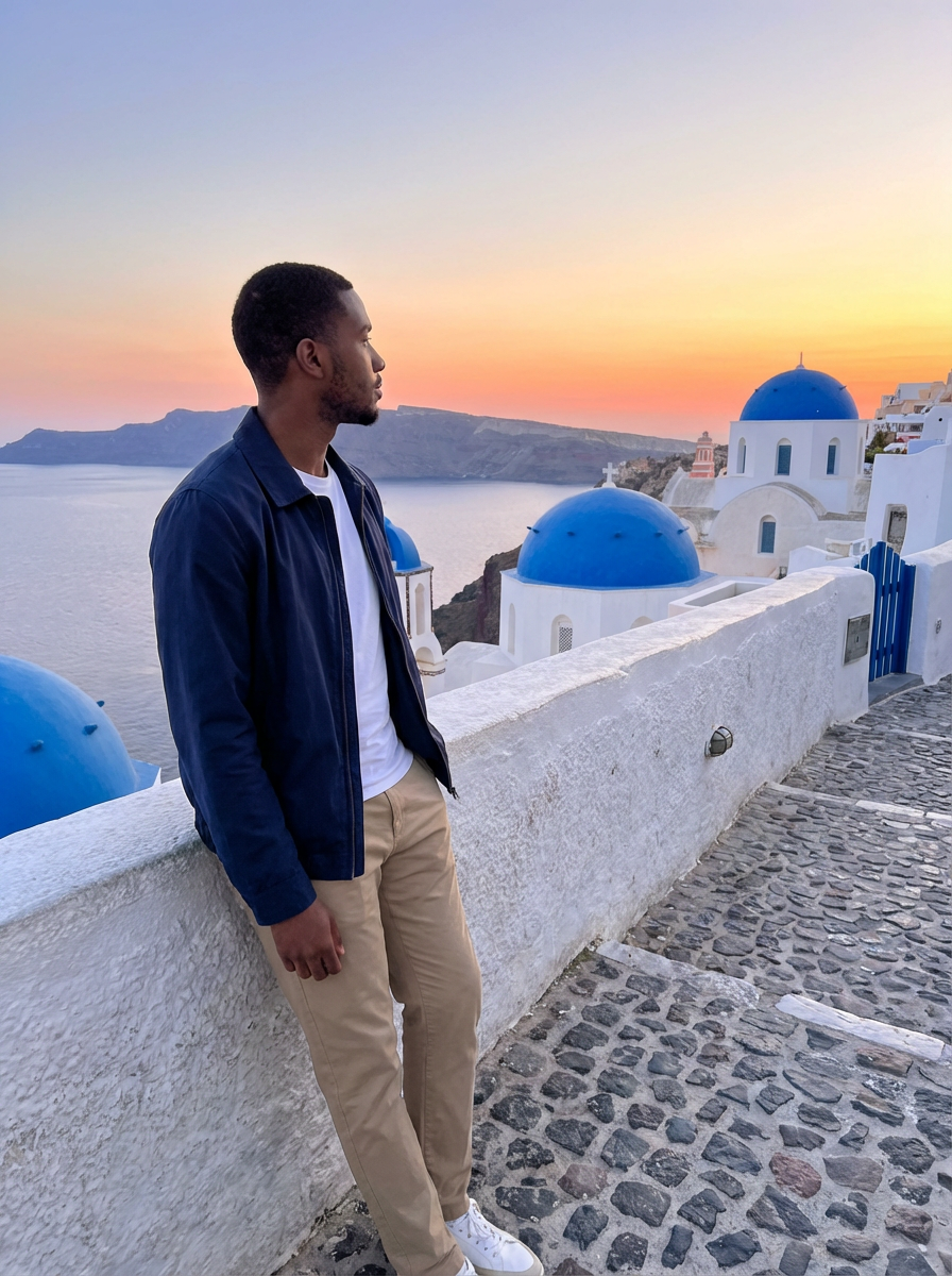 model watching sunset in Imerovigli, wearing smart casual attire with light jacket, famous Santorini sunset colors