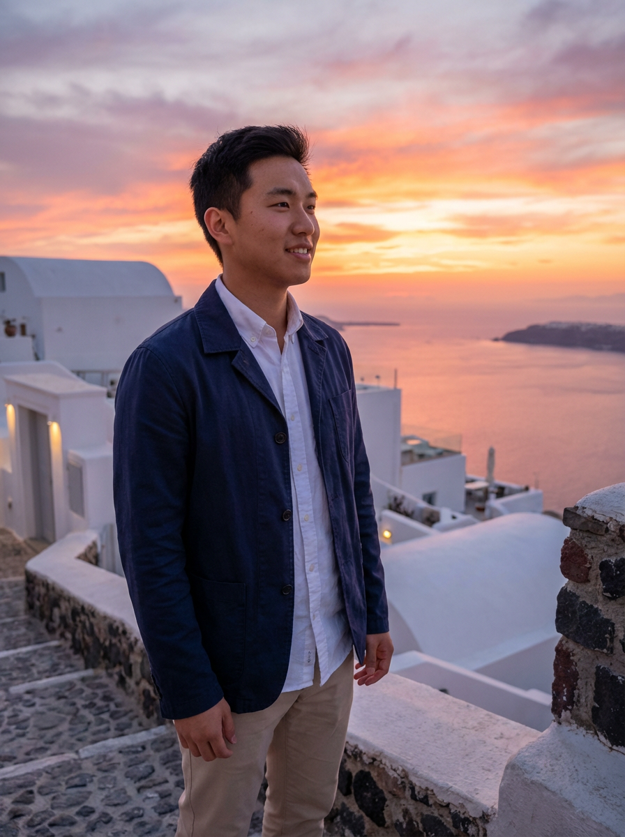 model watching sunset in Imerovigli, wearing smart casual attire with light jacket, famous Santorini sunset colors