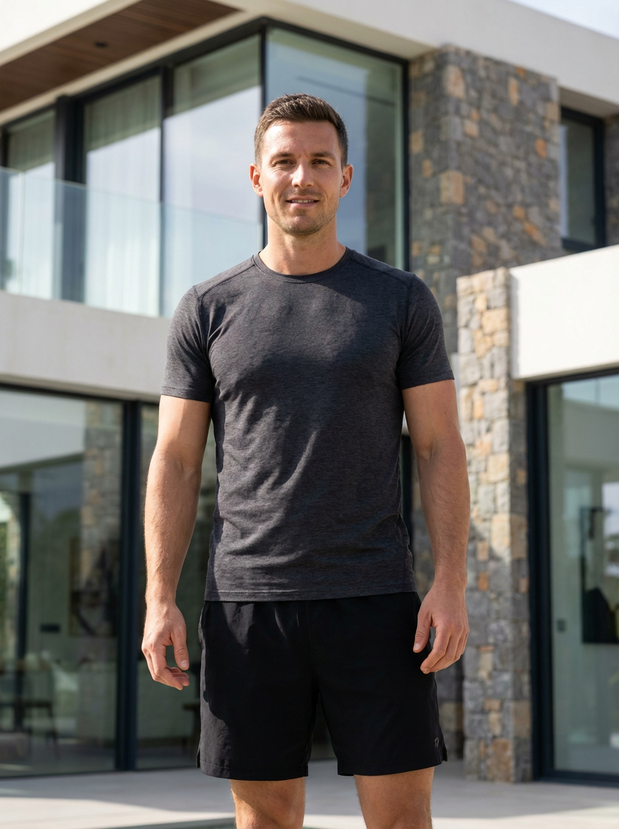 model wearing a t-shirt, masculine figure, wearing a t-shirt, , fit body very model, in front of modern luxury design villa, black shorts, sexy, beautiful, model