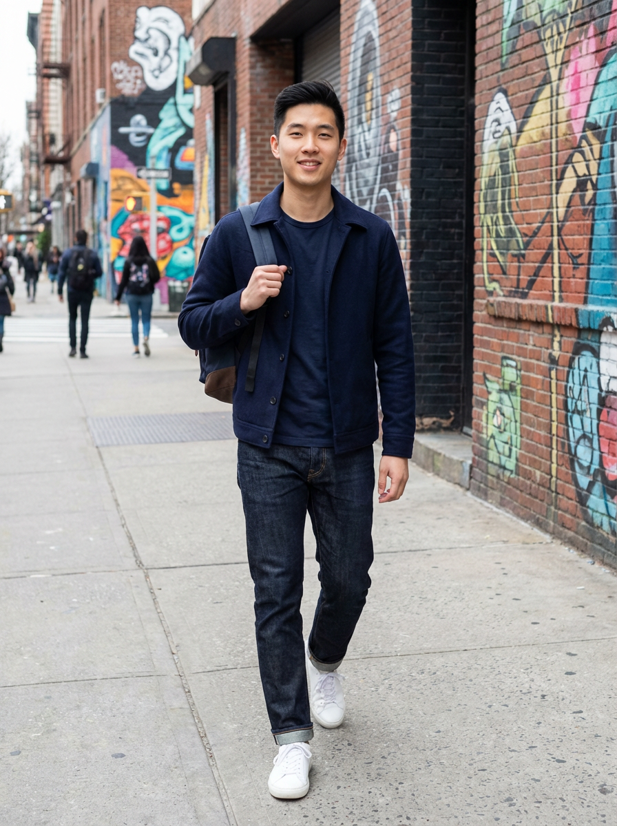 model wearing a trendy outfit, walking down a street lined with colorful murals