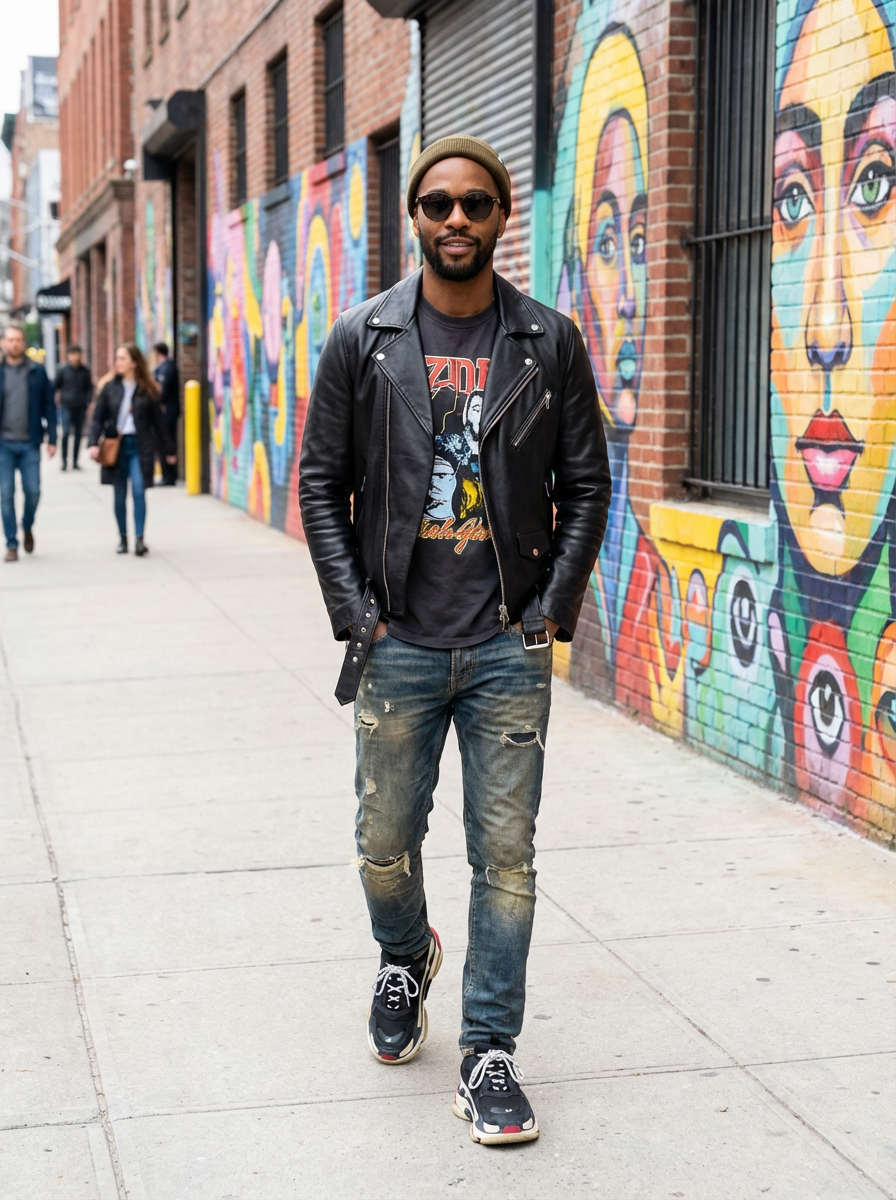 model wearing a trendy outfit, walking down a street lined with colorful murals