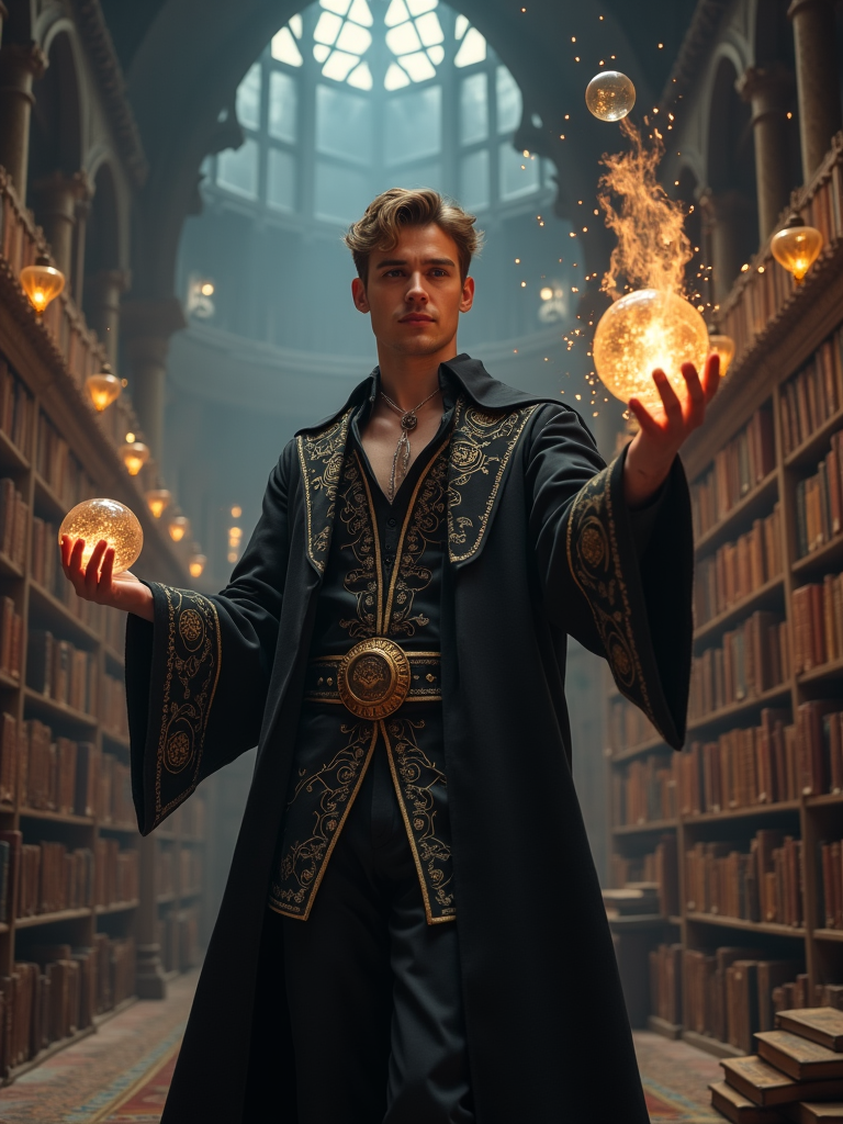 model wearing a wizard outfit with mystical symbols casting spells in an ancient magical library filled with floating books and glowing orbs