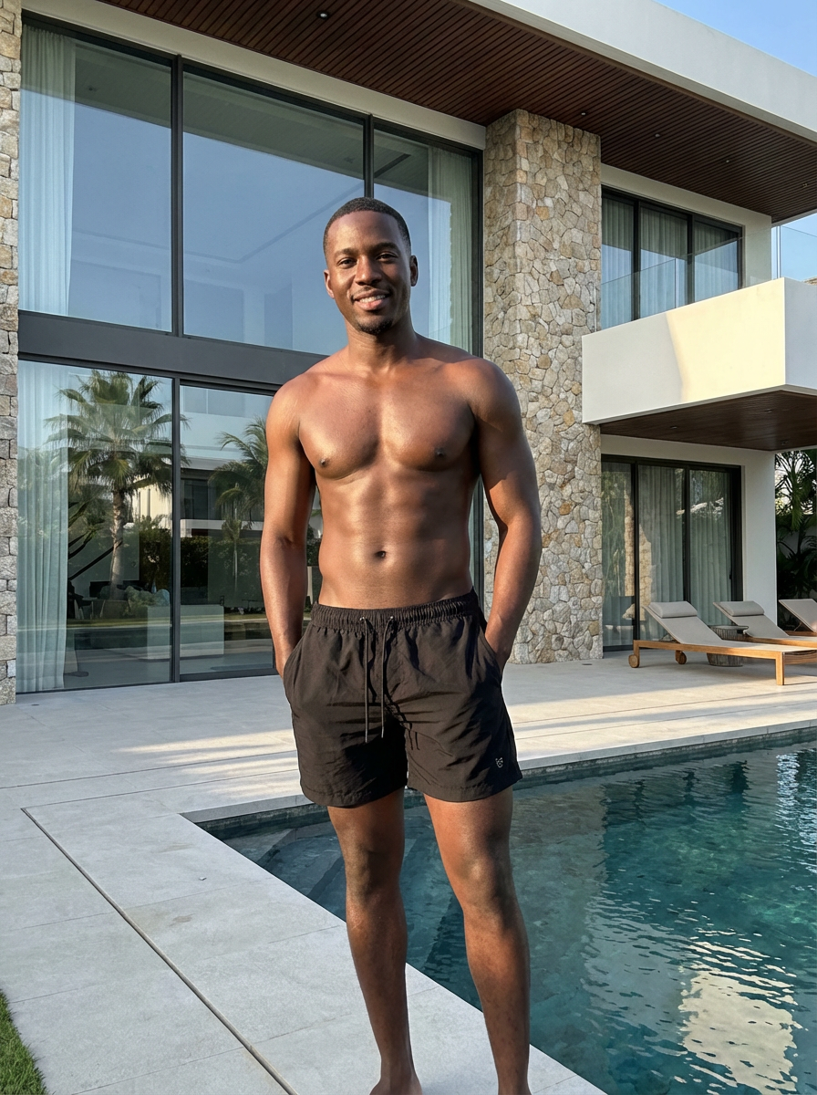 model wearing black swim shorts in front of modern luxury design villa