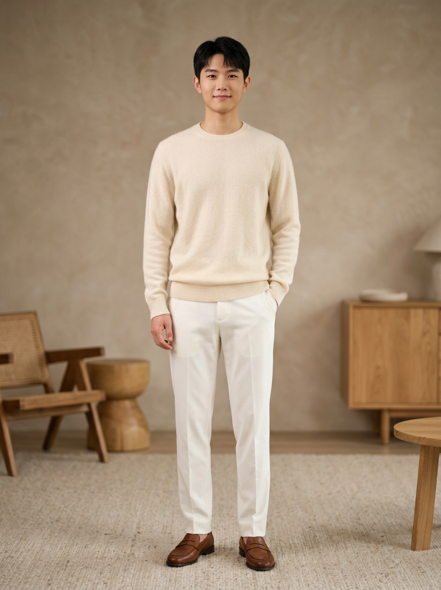 model wearing cream cashmere sweater with white tailored trousers, cozy luxury aesthetic, cloud-like soft textures, warm studio lighting