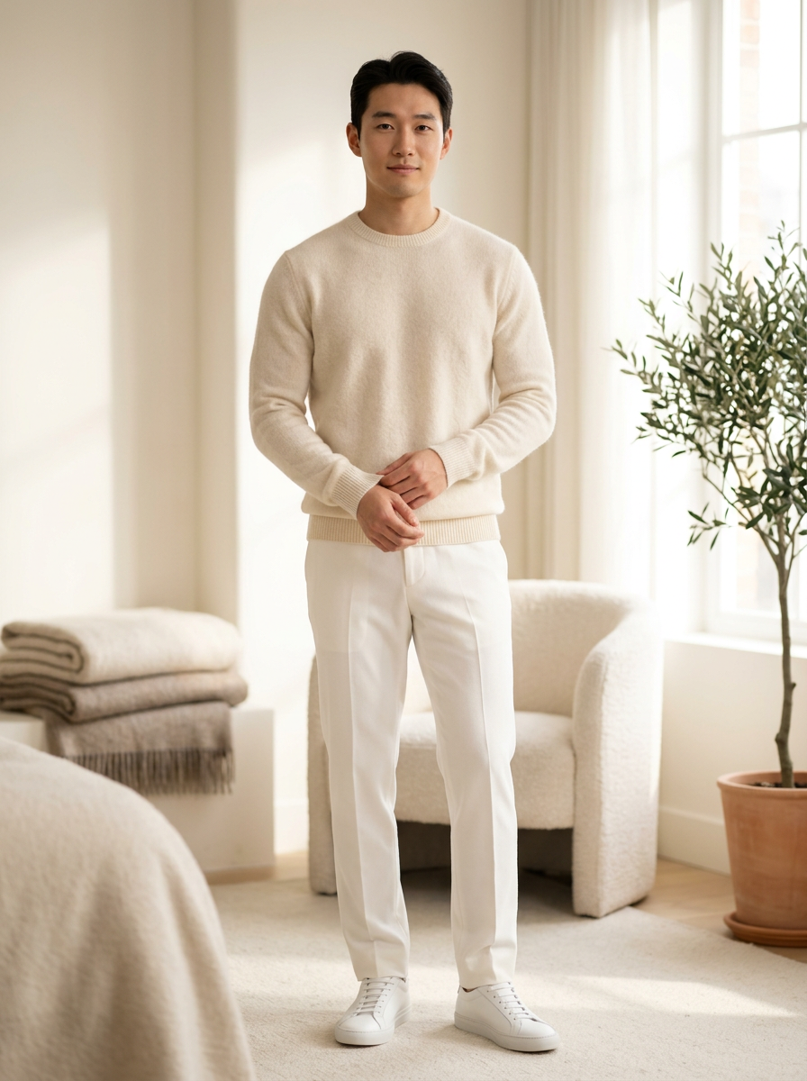 model wearing cream cashmere sweater with white tailored trousers, cozy luxury aesthetic, cloud-like soft textures, warm studio lighting