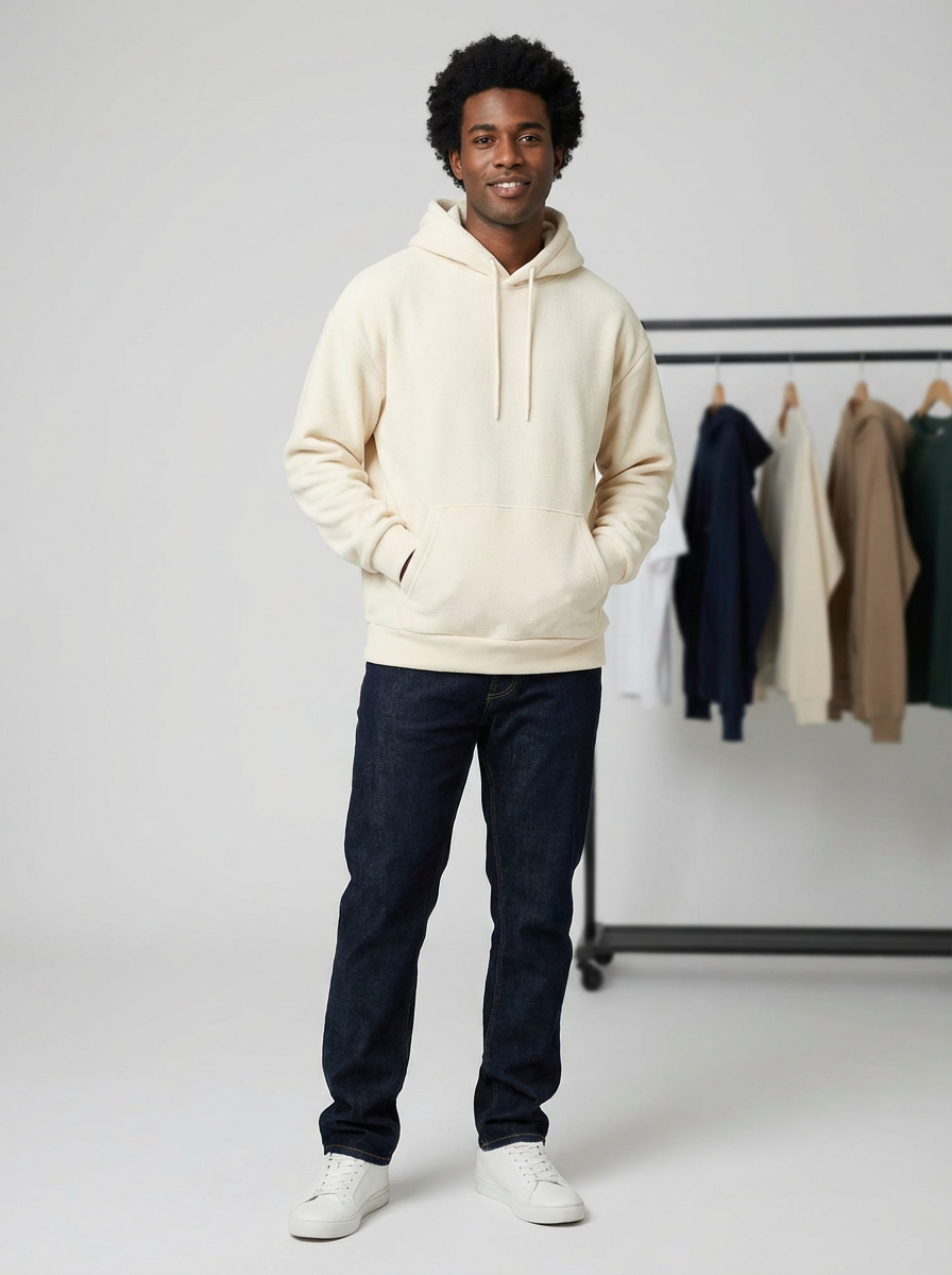 model wearing cream hoodie in try on fashion shoot for Fast fashion brand