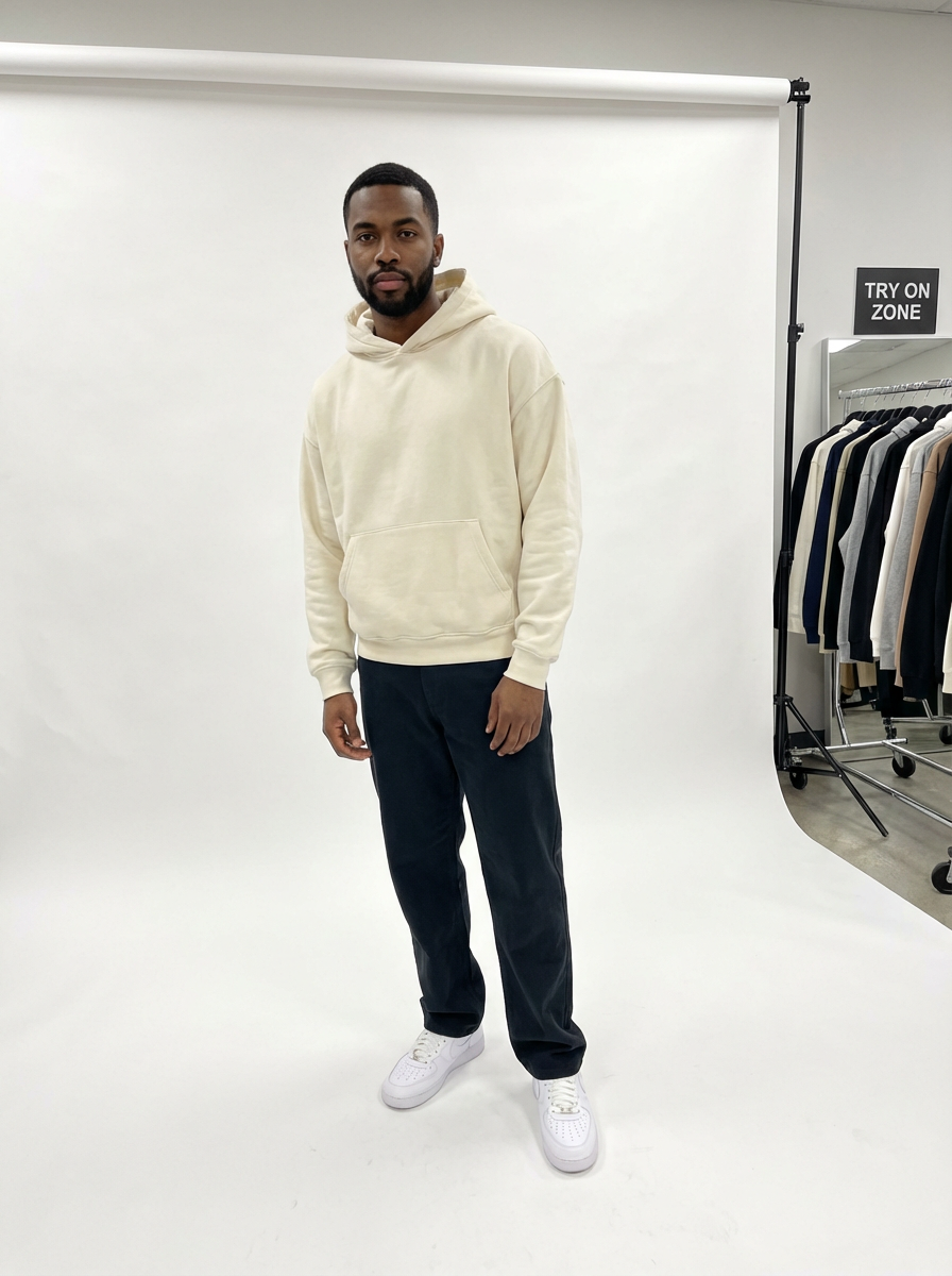 model wearing cream hoodie in try on fashion shoot for Fast fashion brand