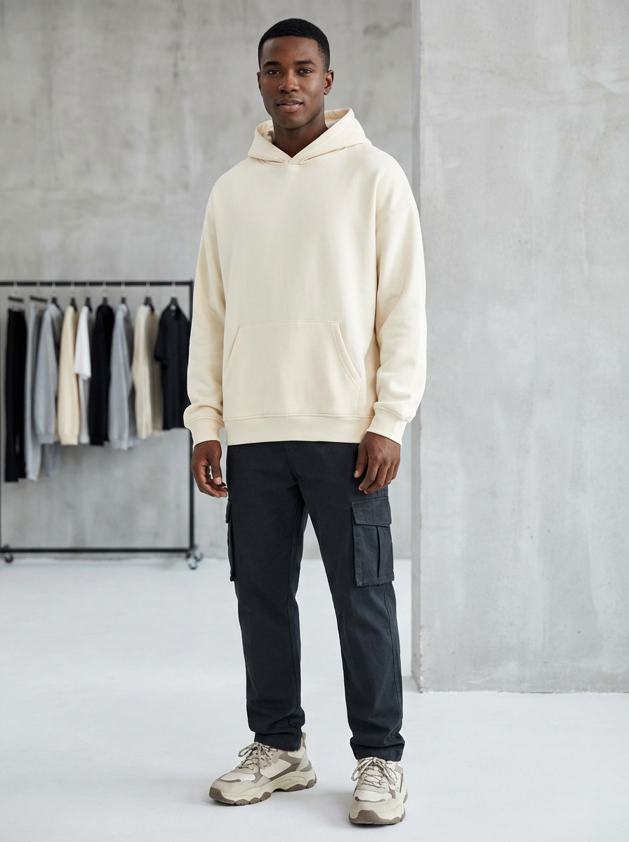model wearing cream hoodie in try on fashion shoot for Fast fashion brand