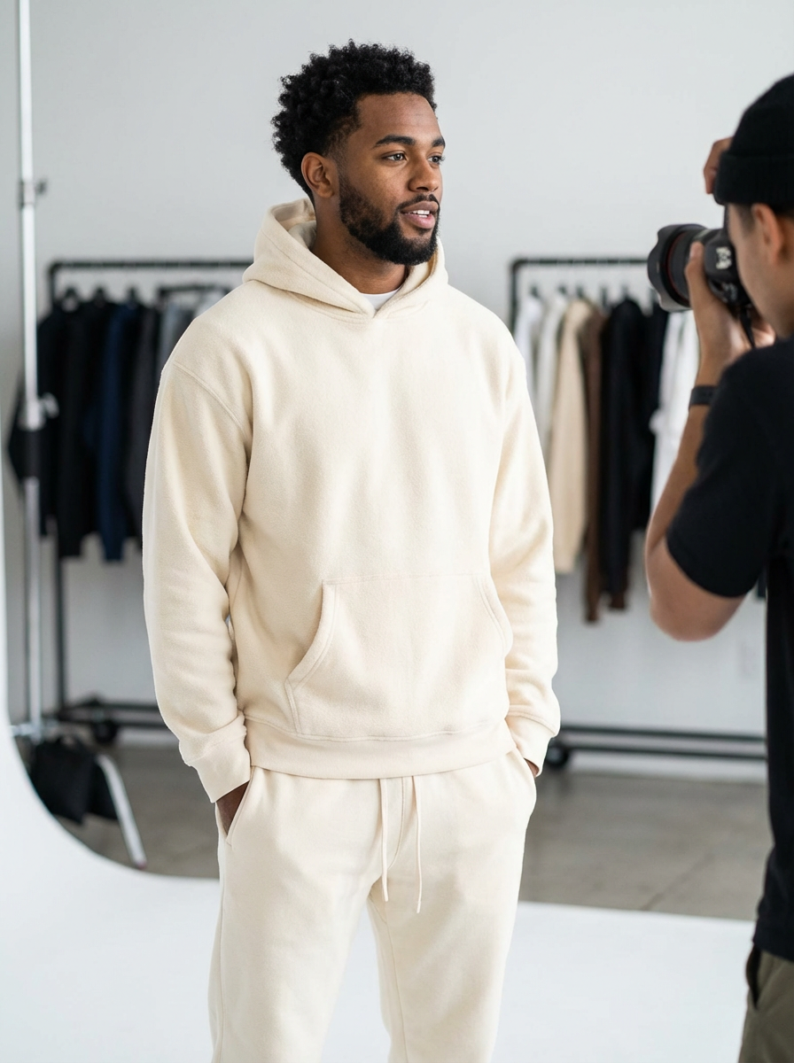 model wearing cream hoodie in try on fashion shoot for Fast fashion brand