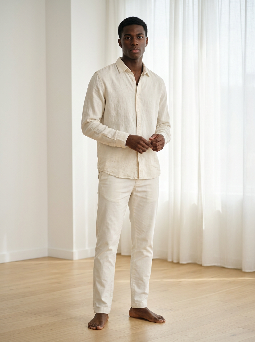 model wearing cream linen shirt and off-white chinos, soft airy textures, ethereal off-white tones, clean minimalist styling, soft diffused natural lighting