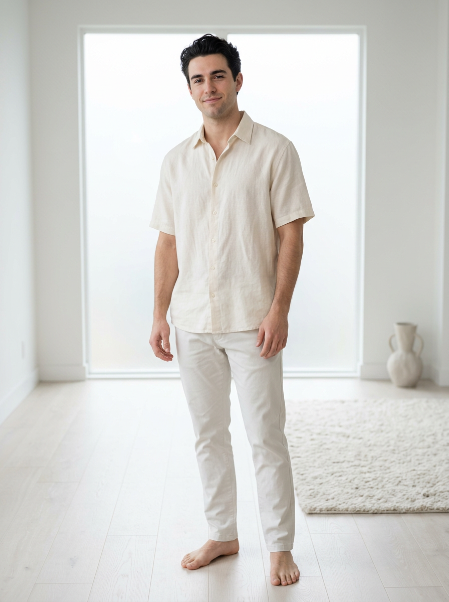 model wearing cream linen shirt and off-white chinos, soft airy textures, ethereal off-white tones, clean minimalist styling, soft diffused natural lighting