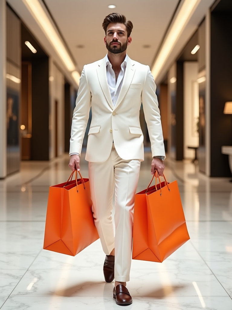 model wearing fitted white suit with loafers, holding many big orange luxury brand shopping bags in marble floor large luxury mall.