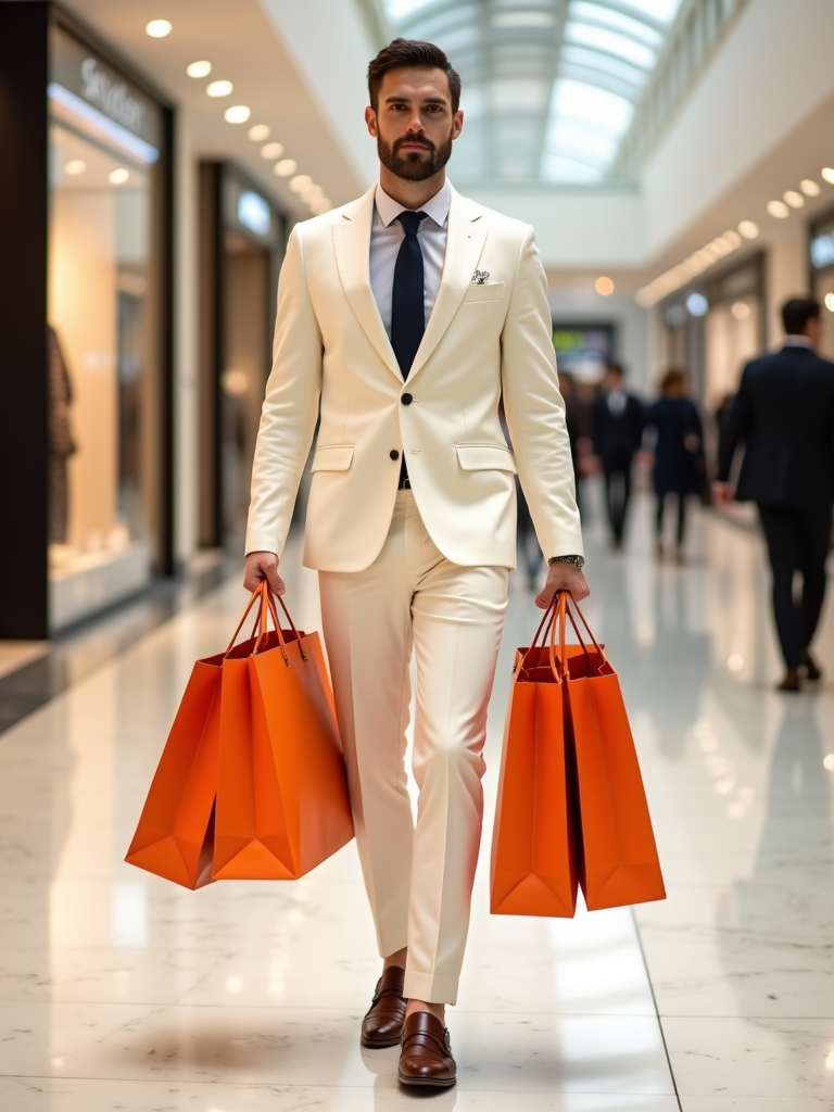 model wearing fitted white suit with loafers, holding many big orange luxury brand shopping bags in marble floor large luxury mall.
