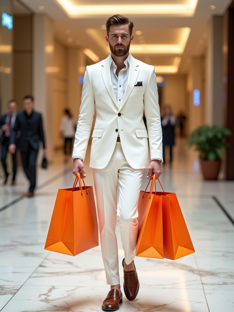 model wearing fitted white suit with loafers, holding many big orange luxury brand shopping bags in marble floor large luxury mall.