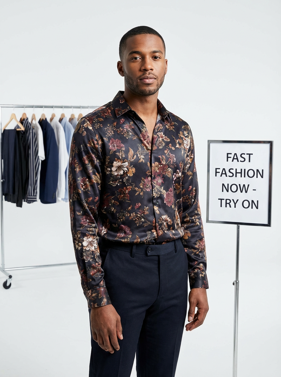 model wearing floral silk shirt in try on fashion shoot for Fast fashion brand