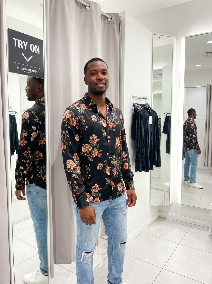 model wearing floral silk shirt in try on fashion shoot for Fast fashion brand