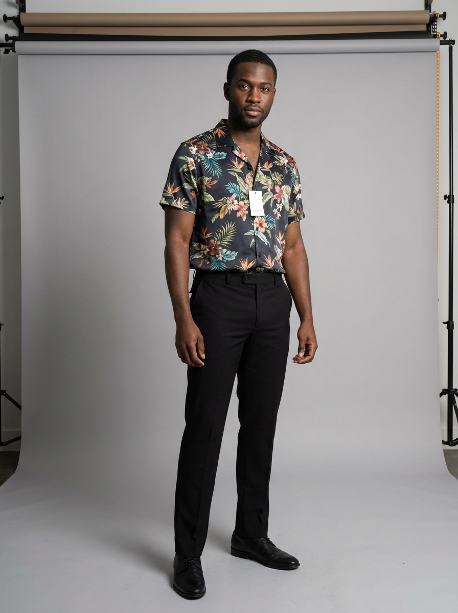 model wearing floral silk shirt in try on fashion shoot for Fast fashion brand