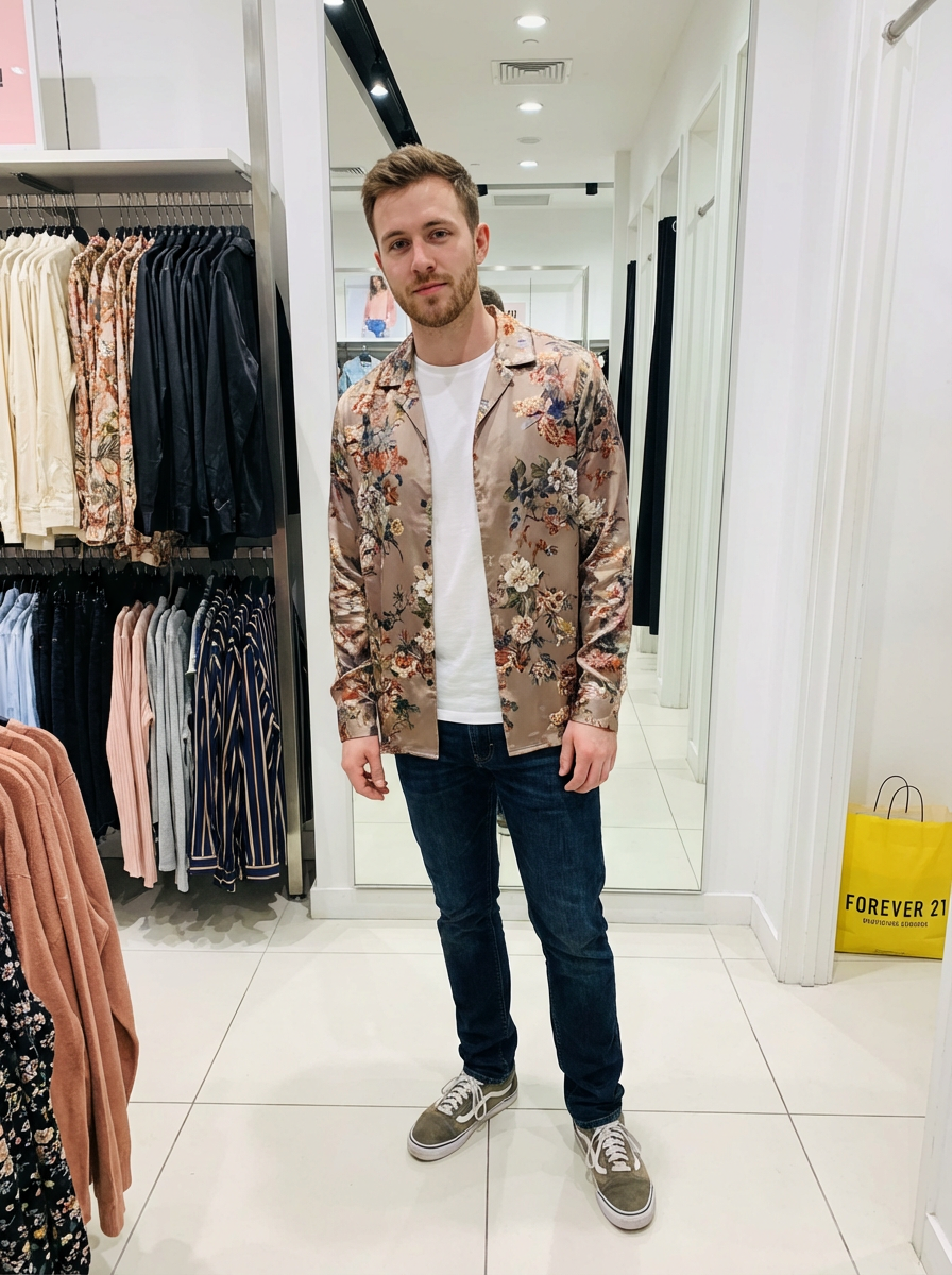 model wearing floral silk shirt in try on fashion shoot for Fast fashion brand