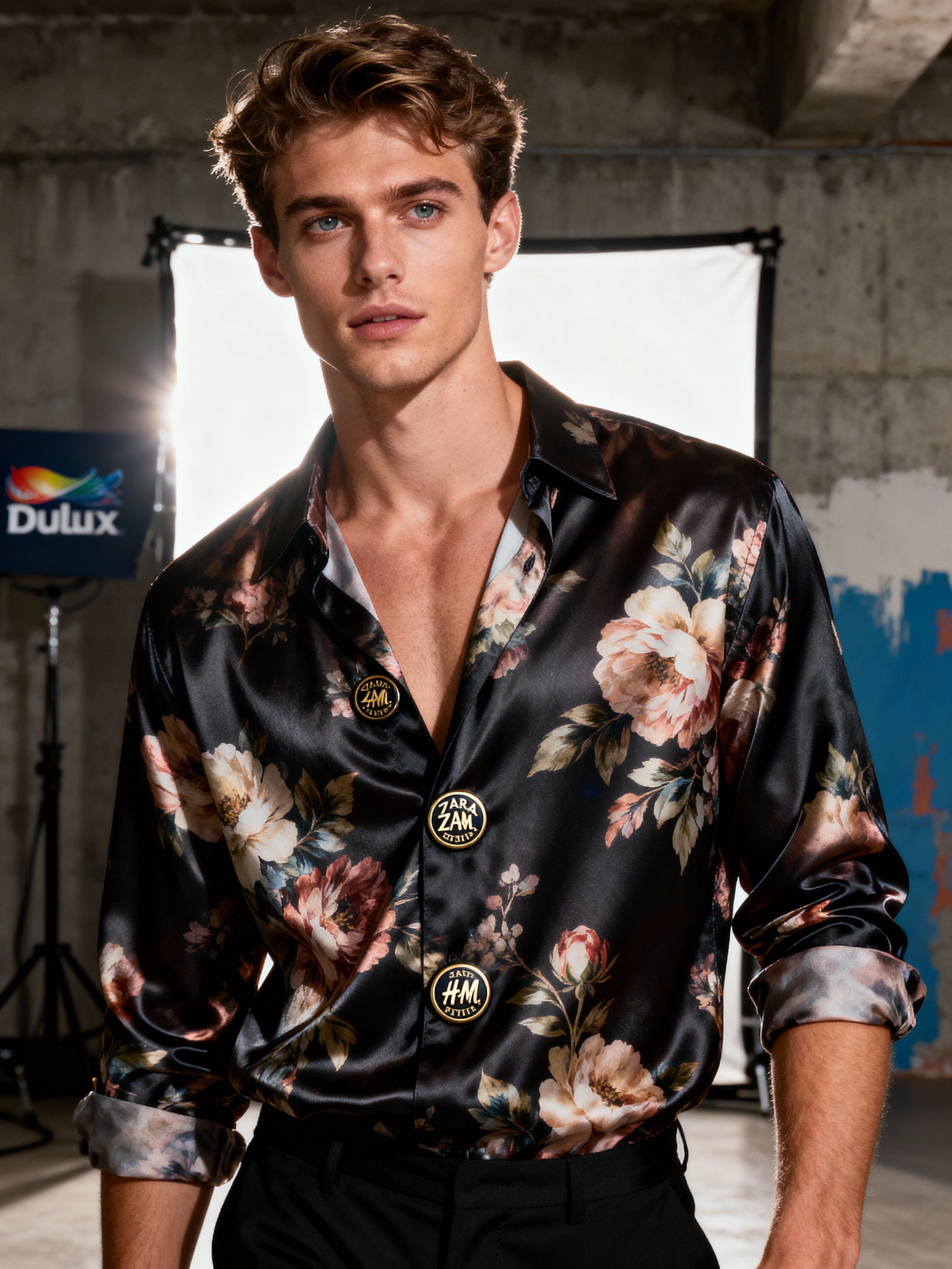 model wearing floral silk shirt in try on fashion shoot for Zara Shein H&M