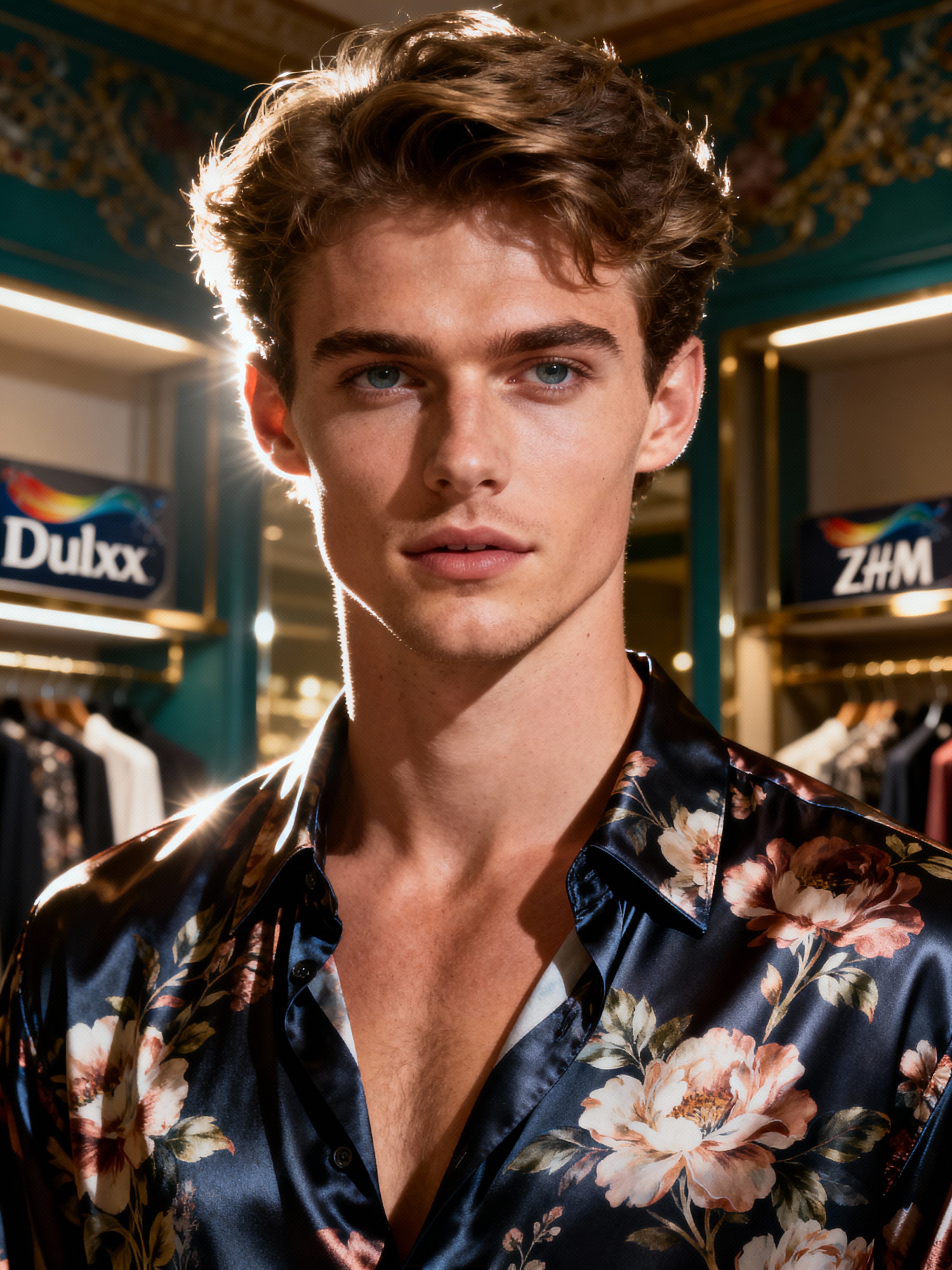 model wearing floral silk shirt in try on fashion shoot for Zara Shein H&M