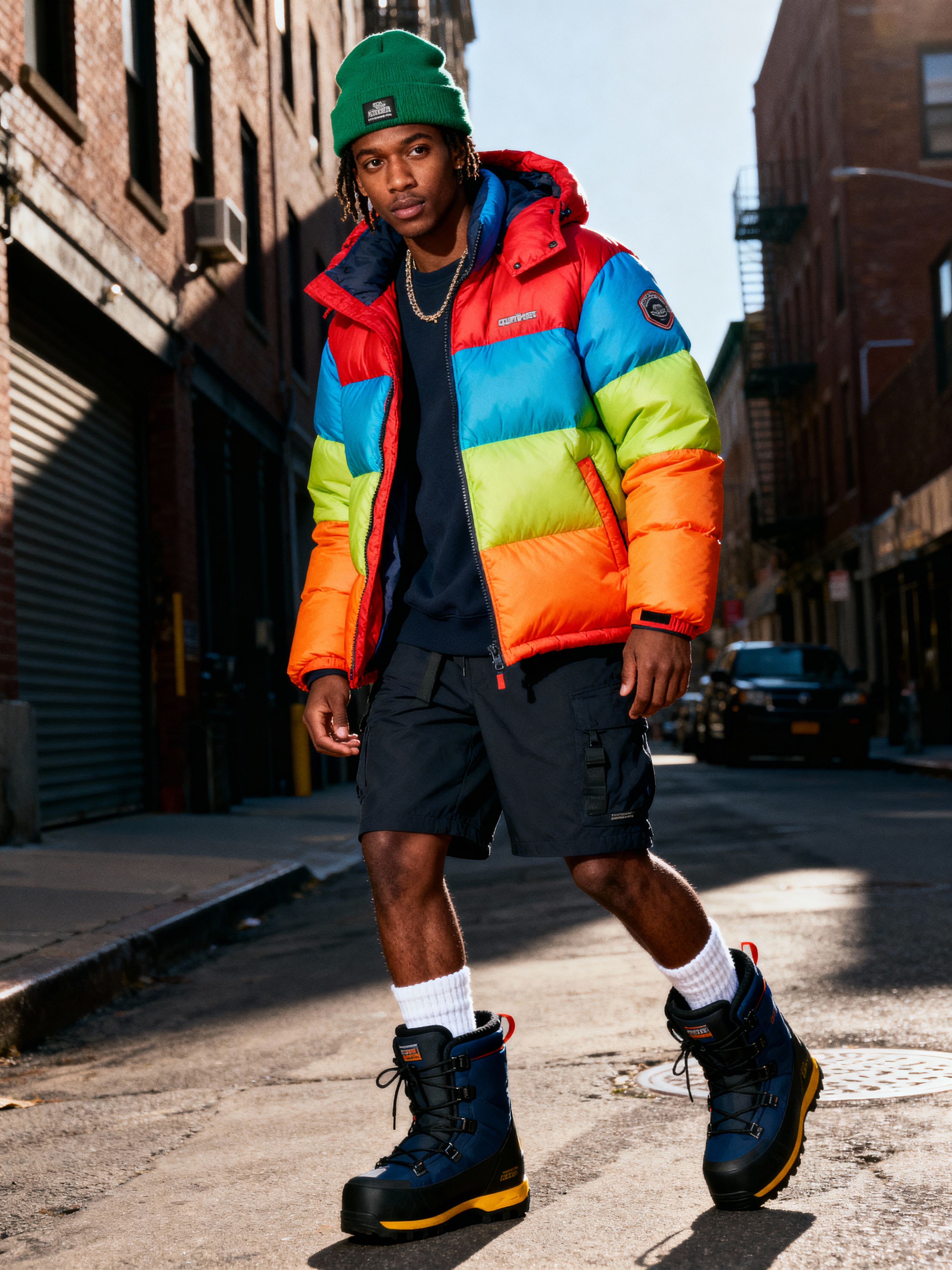 model wearing gorpcore aesthetic, functional outdoor clothing, bright colored puffer jacket, moonboots, beanie, white wool socks, outerwear, posing for photo in the street