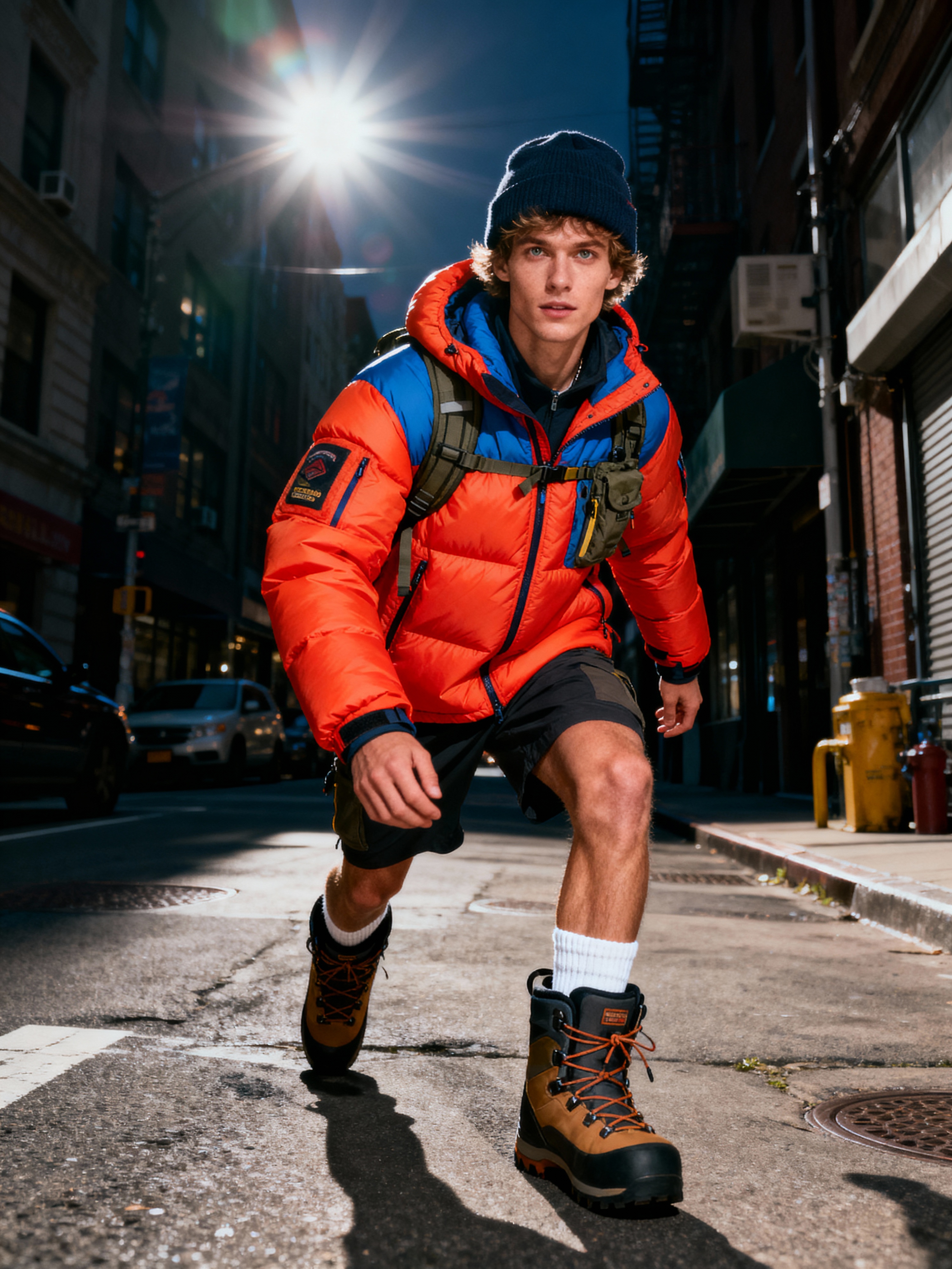 model wearing gorpcore aesthetic, functional outdoor clothing, bright colored puffer jacket, moonboots, beanie, white wool socks, outerwear, posing for photo in the street