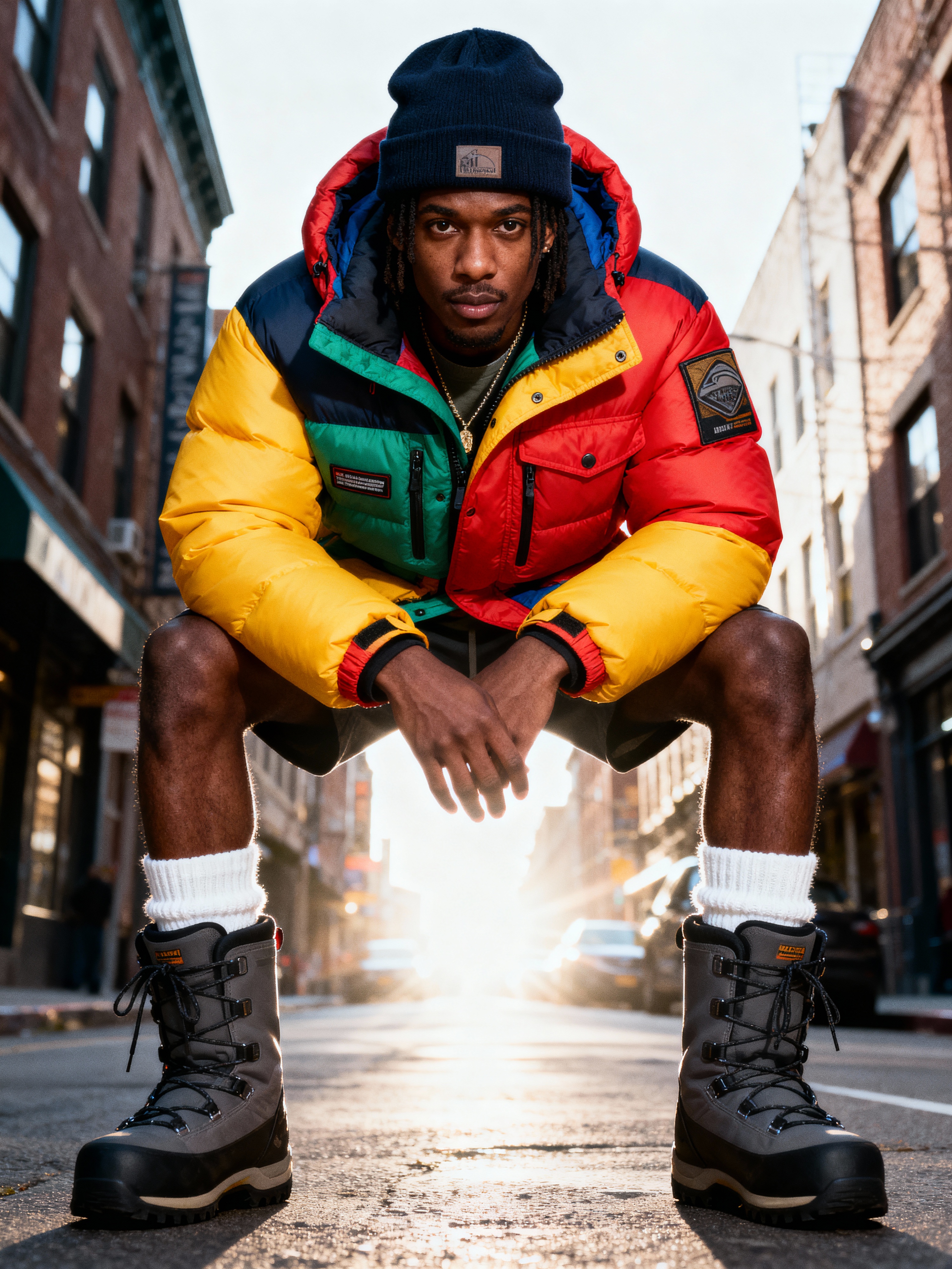 model wearing gorpcore aesthetic, functional outdoor clothing, bright colored puffer jacket, moonboots, beanie, white wool socks, outerwear, posing for photo in the street